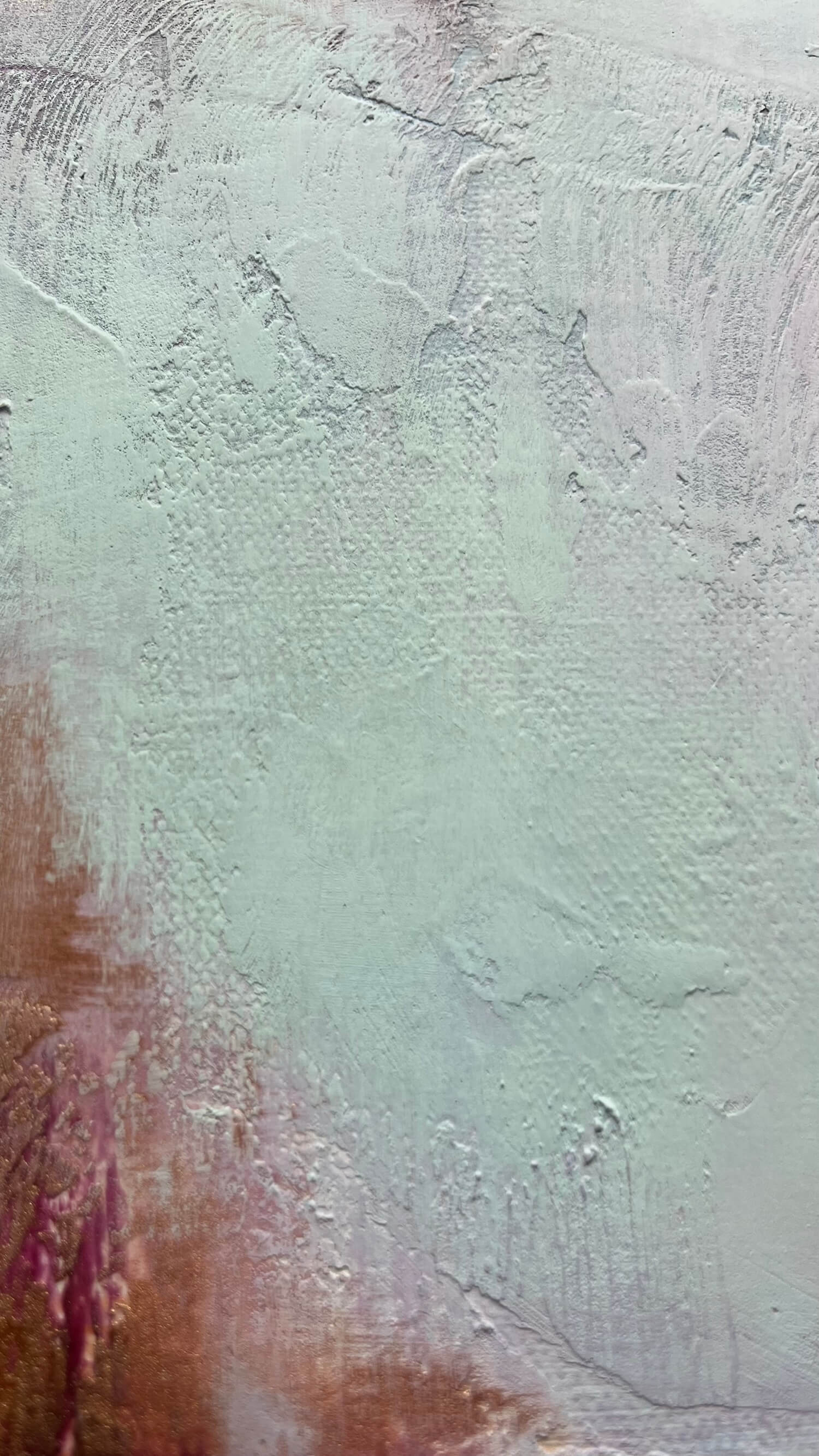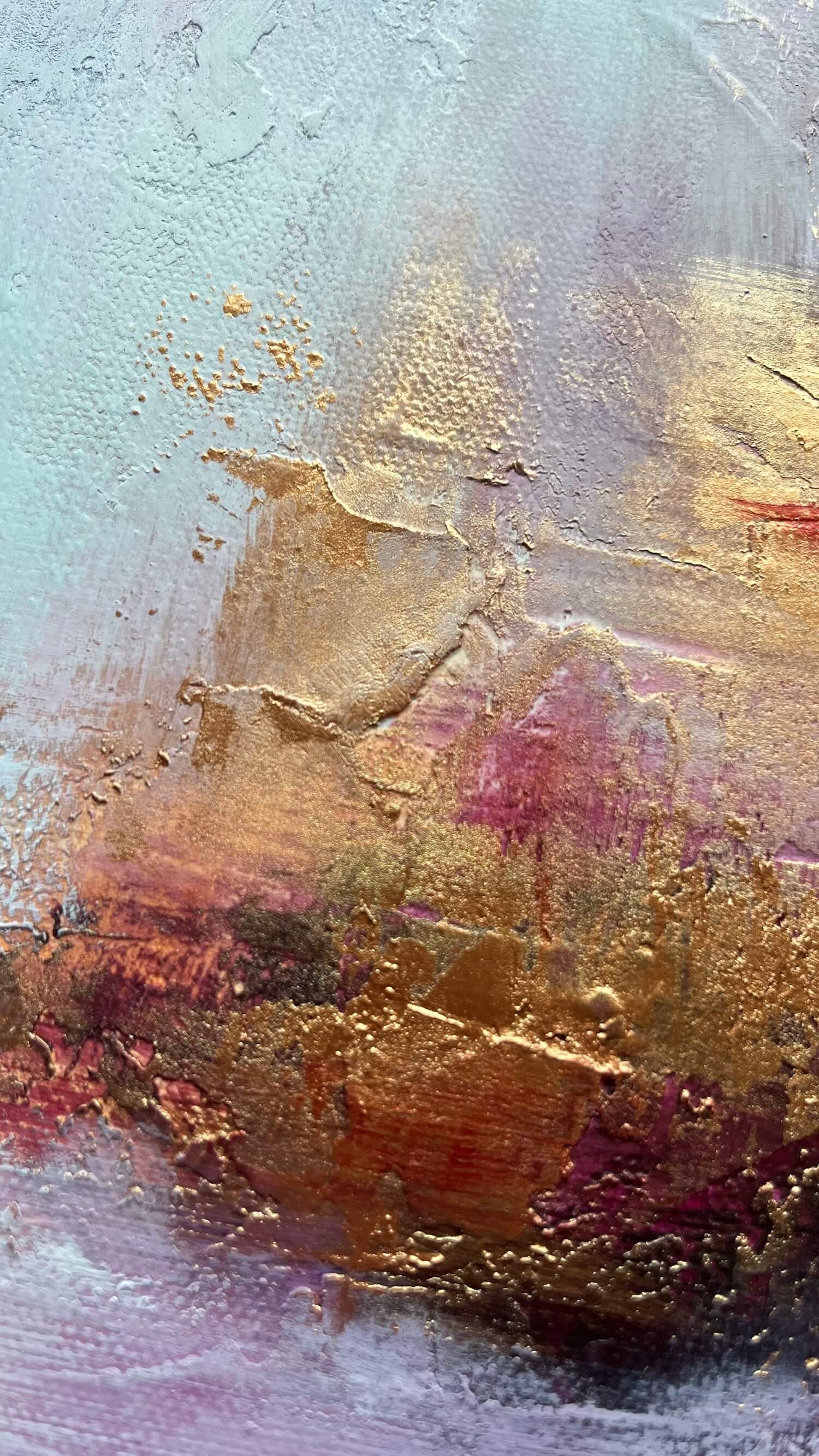 Warm earth tones and accents of gold build like layers of soil and rock. Texture is prominent. The paint forms a textured surface that catches the light and creates subtle shadows. This gives the work a tangible depth and a quiet intensity.