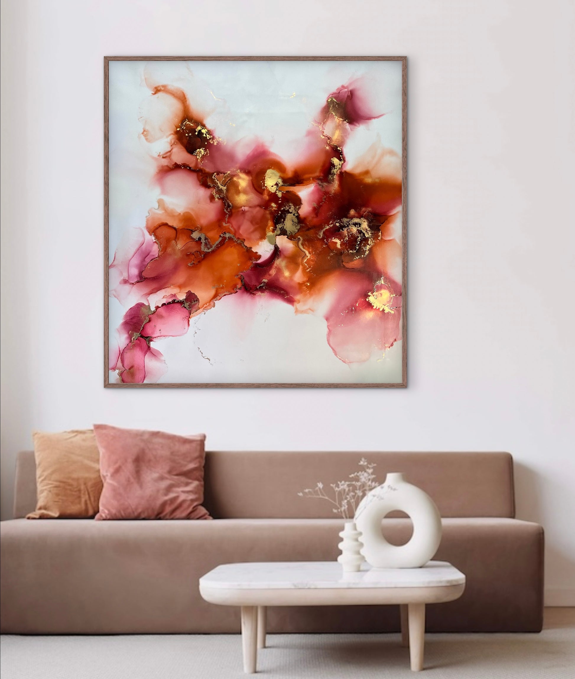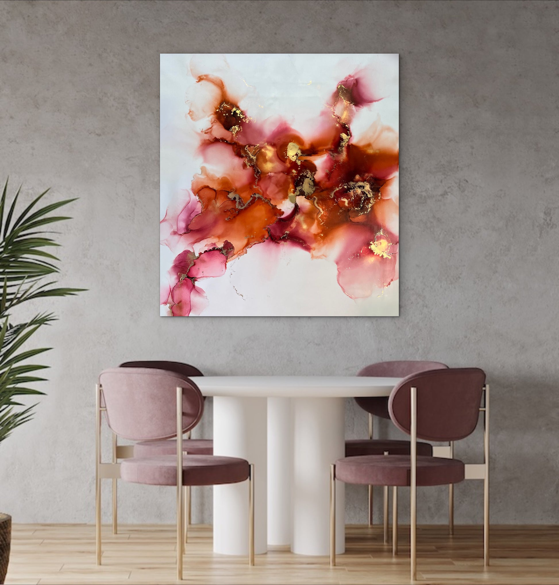 Abstract schilderij waarin warme tinten van amber, rood en goud samensmelten tot een harmonieuze beweging. De transparante lagen en glinsterende details creëren een gevoel van diepte en elegantie. Dit kunstwerk straalt warmte en luxe uit, en vormt een stijlvolle blikvanger in elk modern interieur.