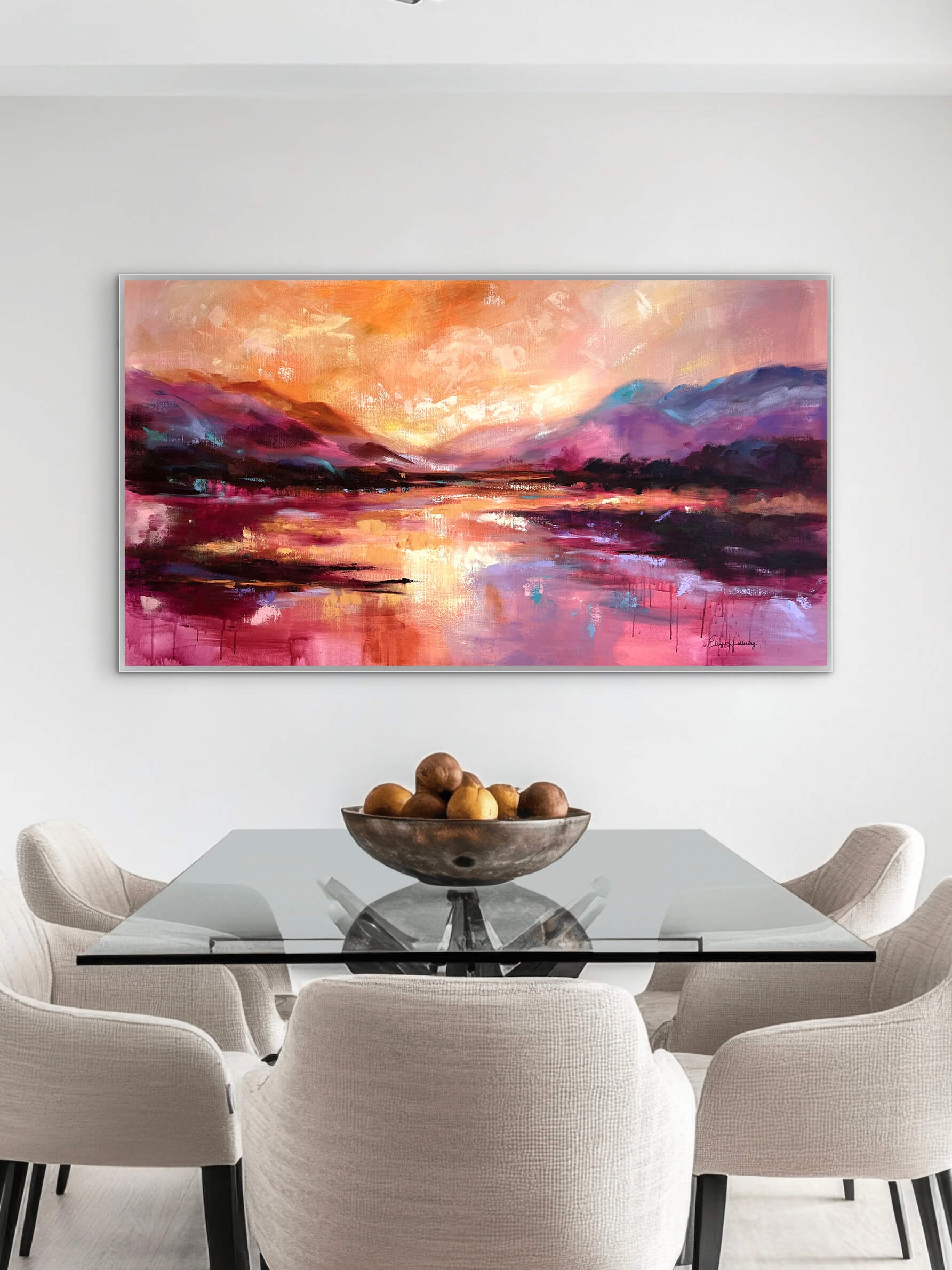 Origineel XXL abstract landschap waarin warmte en licht samenkomen in een spel van kleur en beweging. Tinten van zacht oranje, dieproze en violet vloeien samen met gouden reflecties die doen denken aan het laatste zonlicht over een stille vallei. De lagen verf en afwisseling van krachtige en subtiele penseelstreken creëren diepte en glans, alsof de horizon zelf oplost in licht. Golden Mirage vangt dat vluchtige moment waarop alles even lijkt te verdwijnen in rust, schoonheid en stilte.
