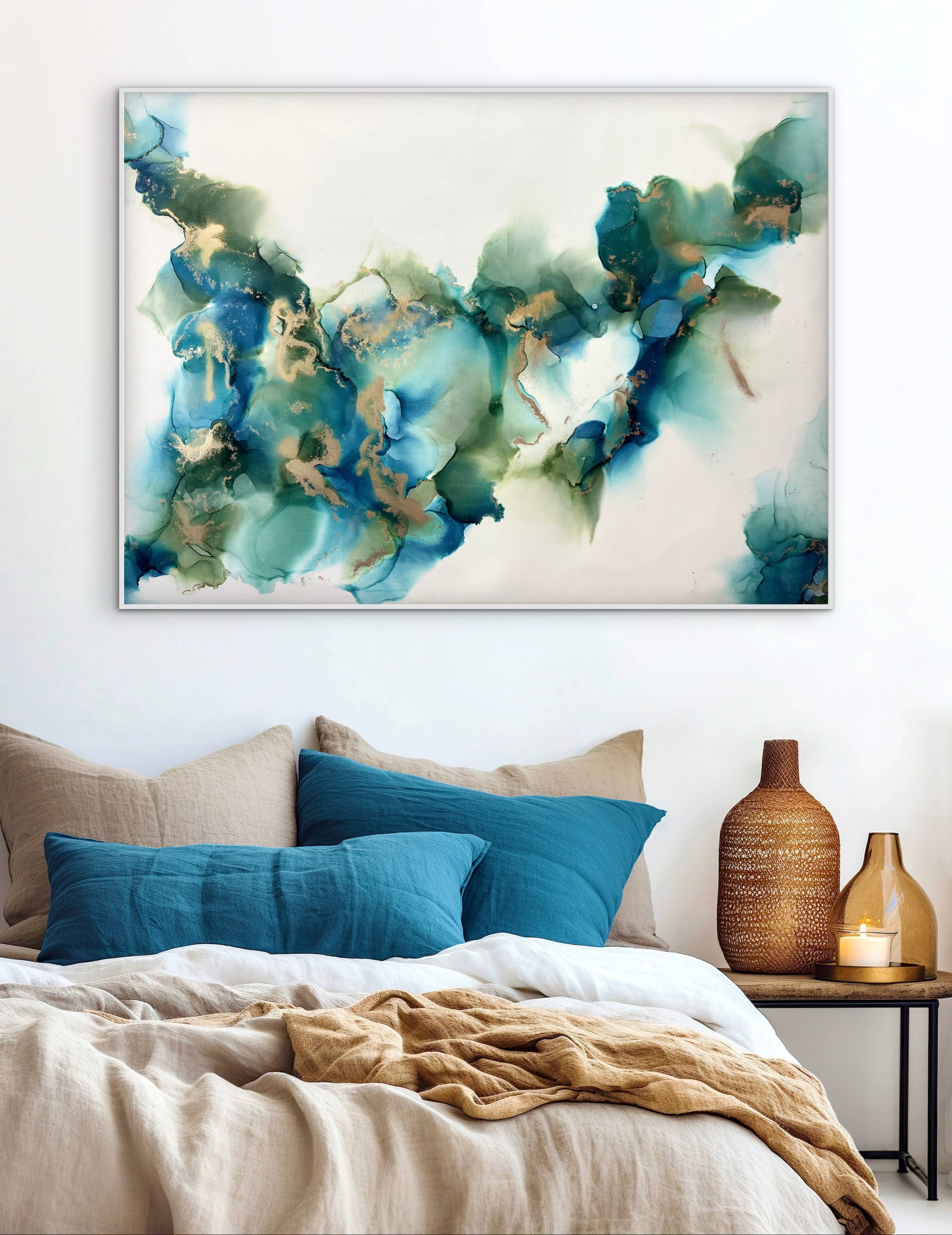 Origineel XXL abstract schilderij met een moderne en elegante uitstraling, geïnspireerd door de beweging van water. Diepe tinten van blauw, turquoise en smaragdgroen vloeien samen met subtiele gouden accenten, waardoor het werk een frisse en luxueuze sfeer uitstraalt. De transparante lagen geven diepte en beweging, alsof je naar stromingen in de oceaan kijkt. Een uniek kunstwerk dat rust en stijl toevoegt aan elk interieur.